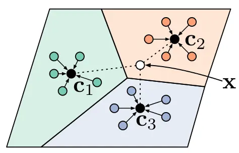 该方法思想十分简单高效,效果也非常好。它学习一个度量空间, 通过计算和每个类别的原型表达的距离来进行分类。文章基于这样的想法:每个类别都存在一个聚在某单个原型表达周围的embedding,该类的原型是support set在embedding空间中的均值。然后,分类问题变成在embedding空间中的最近邻。如图8,c1、c2、c3分别是三个类别的均值中心(称Prototype),将测试样本x进行embedding后,与这3个中心进行距离计算,从而获得x的类别。