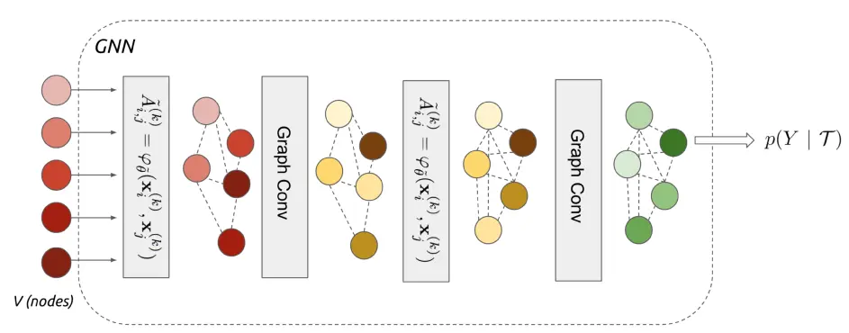 这是一篇比较新的文章,提交到ICLR 2018[4]。他定义了一个图神经网络框架,端到端地学习消息传递的“关系”型任务。在这里,每个样本看成图的节点,该方法不仅学习节点的embedding,也学习边的embedding。如图9,在网络第一层5个样本通过边模型A~构建了图,接着通过图卷积(graph conv)获得了节点的embedding,然后在后面的几层继续用A~更新图、用graph conv更新节点embedding, 这样便构成了一个深度GNN,最后输出样本的预测标签。