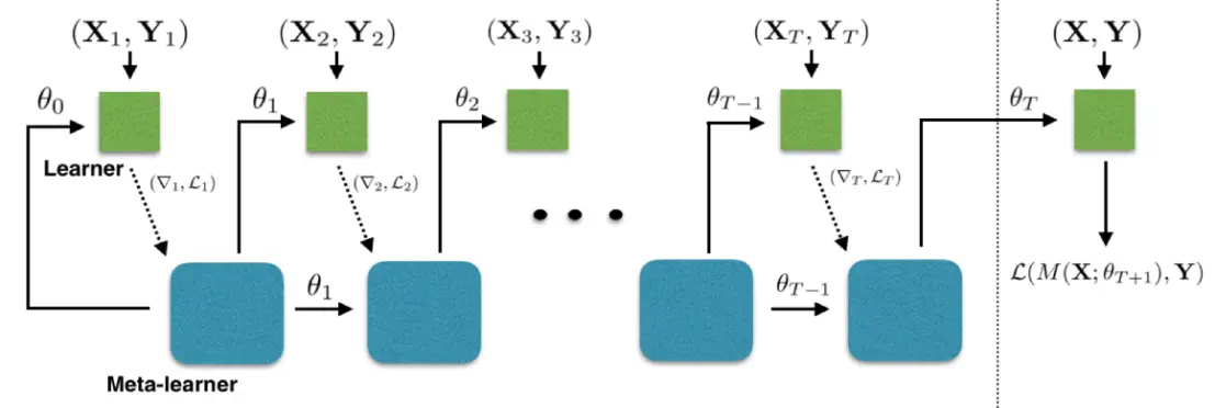 在meta learning中,我们在训练集上训练一个训练过程(meta learner)来生产生一个分类器(learner)使得learner在测试集上获得高的精度。如下图