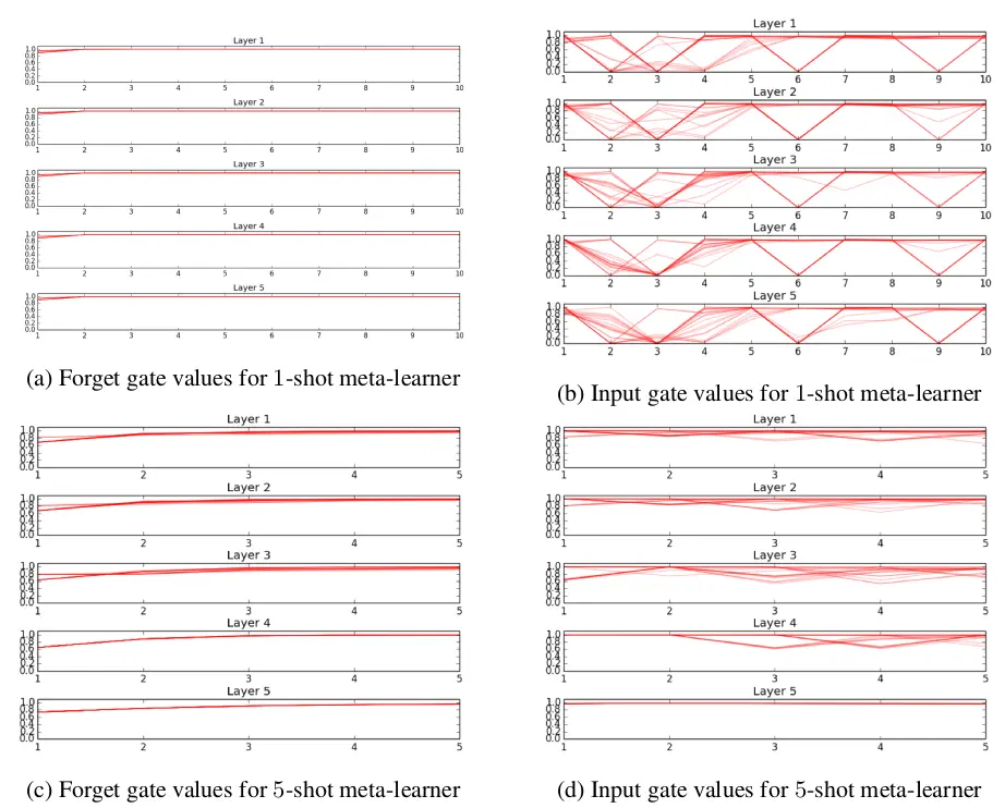 对meta-learner的训练过程进行可视化,把gate的值画出来,观察其在不同的数据之间是否存在变化。在1-shot上,meta learner学了10步,5-shot上学了5步。对于遗忘门,meta-leanrer采用一个简单的权值衰减策略,而且每层都比较一致。输入门在不同数据上的变化比较大,说明meta learner没有采用一个固定的优化策略,而且1-shot和5-shot的表现也不同,说明meta learner对两者采用了不同的方法。如图14: