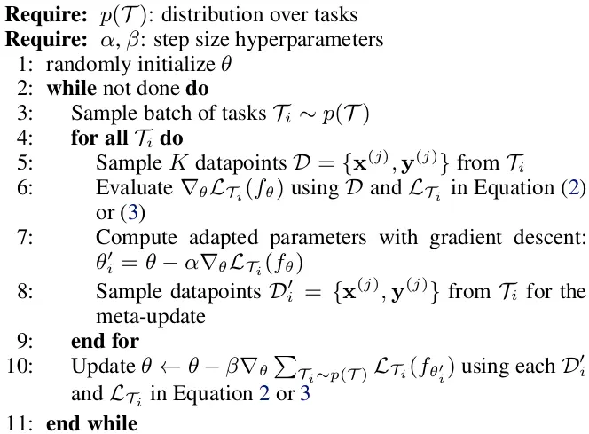 整个训练的流程如下伪代码,有内外两个循环,外循环是训练meta learner的参数θ,即一个全局的模型,内循环对每个采样任务分别做梯度下降,进而在全局模型上做梯度下降(a gradient through a gradient)。