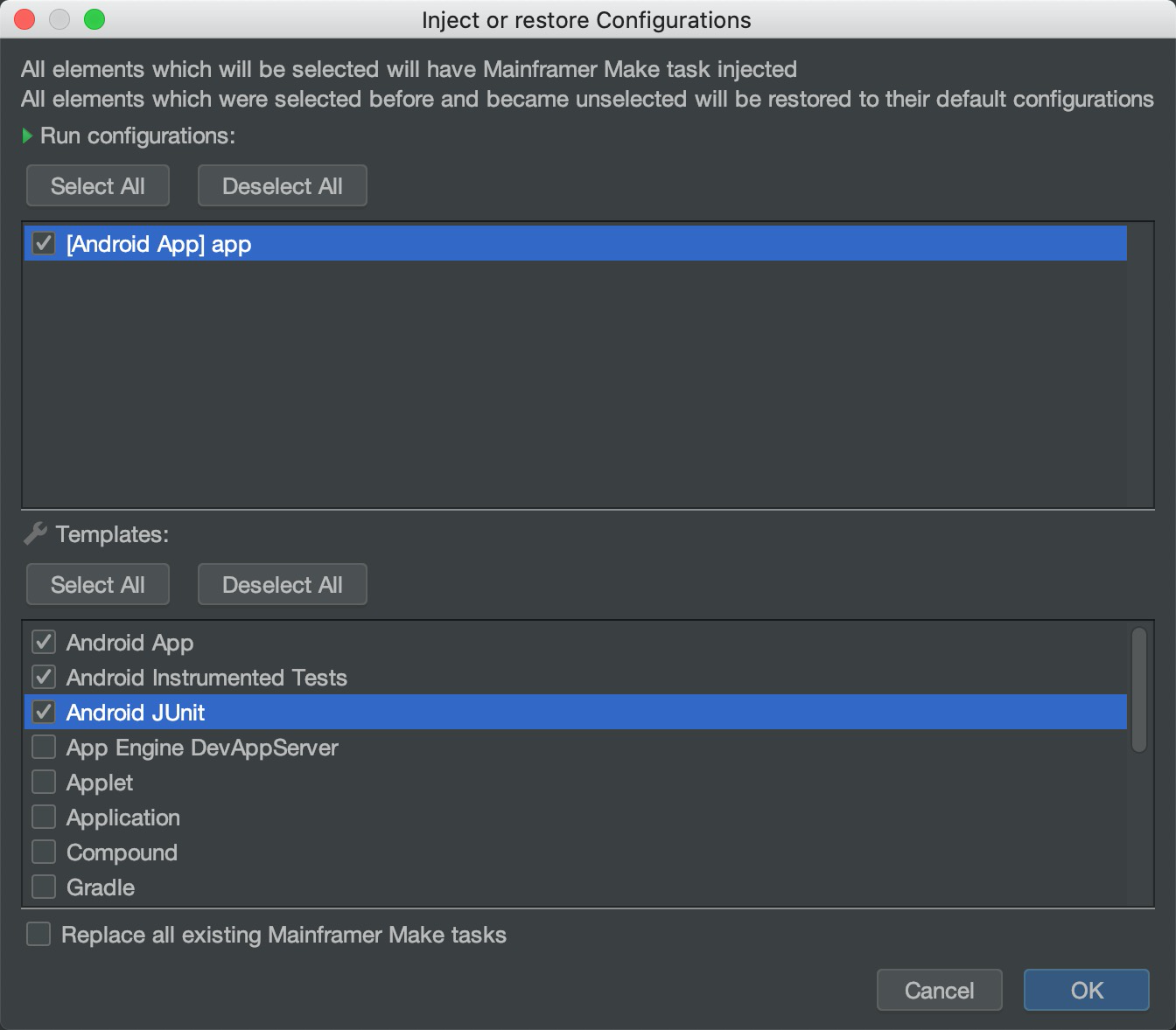 然后选择要注入的模板,上面是已经创建好的编译配置。下面是Android Studio自带的模板。 选择需要注入的配置即可。后面也可以随时来取消选择,将注入的模板还原回去。