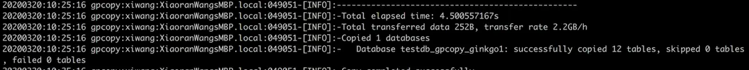 当所有表拷贝完成时,GPCOPY会如上图一样显示本次拷贝总共花费的时间,总共传输的数据量及平均传输速度。