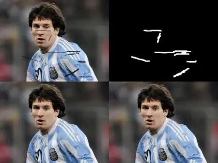 基于此目的设计了几种算法,OpenCV提供了其中两种。 两者都可以通过相同的函数进行访问,cv.inpaint()