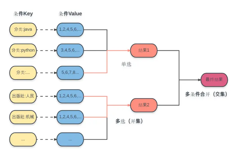这里每个条件都事先将计算好的结果集ID存入对应的key中,选用的数据结构是集合(Set)。查询操作包括: