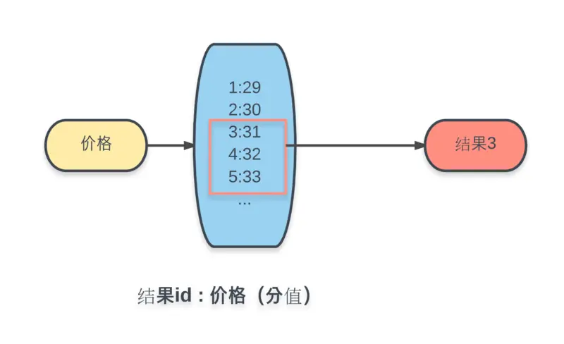 将所有商品加入 Key 为价格的有序集合中,值为商品ID,每个值对应的分数为商品价格的数值。这样在 Redis 的有序集合中就可以通过ZRANGEBYSCORE命令,根据分数(价格)区间,获取相应结果集。