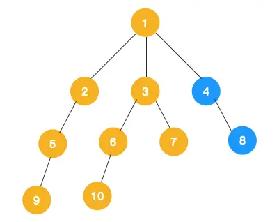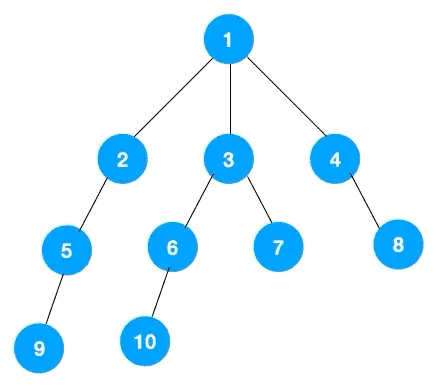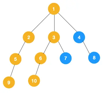 1、我们从根节点 1 开始遍历,它相邻的节点有 2,3,4,先遍历节点 2,再遍历 2 的子节点 5,然后再遍历 5 的子节点 9。