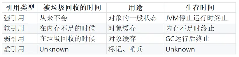 引用队列(ReferenceQueue):当GC(垃圾回收线程)准备回收一个对象时,如果发现它还仅有软引用(或弱引用,或虚引用)指向它,就会在回收该对象之前,把这个软引用(或弱引用,或虚引用)加入到与之关联的引用队列(ReferenceQueue)中。如果一个软引用(或弱引用,或虚引用)对象本身在引用队列中,就说明该引用对象所指向的对象被回收了。无实际的存储结构,存储逻辑依赖于内部节点之间的关系来表达。