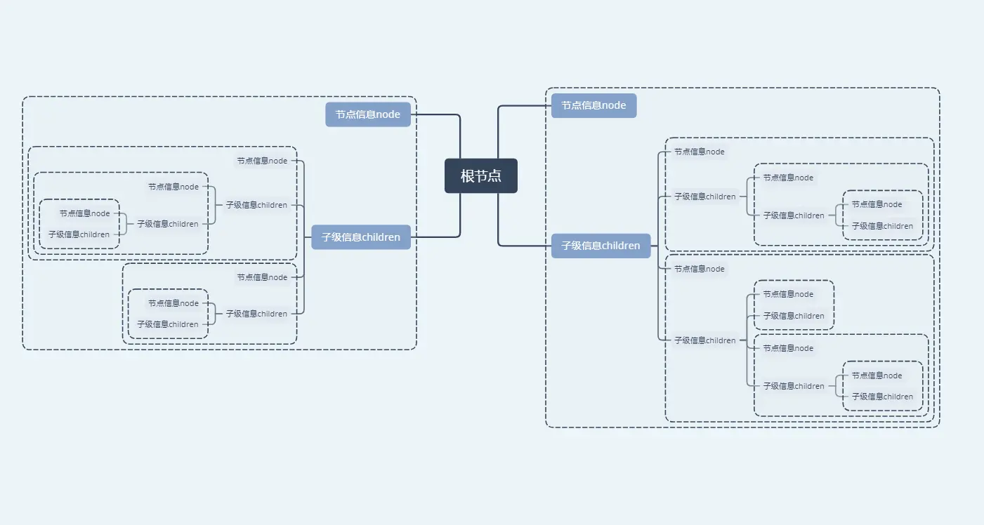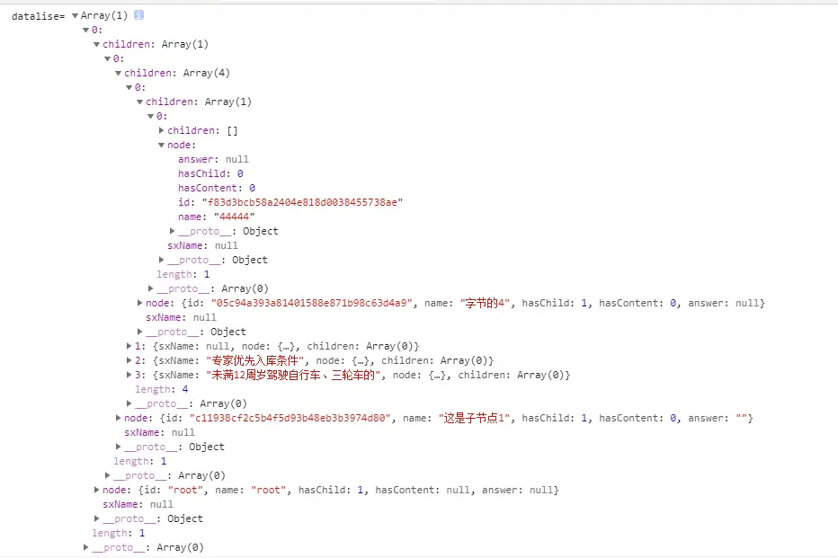 - 后端返回如下格式的数组,数组分为两个子数组node和children,node存着当前节点的信息(如节点名称,知识点等),children存着下一个节点的信息,children数组的结构也是有两个子数组node和children,具体结构如下图:
