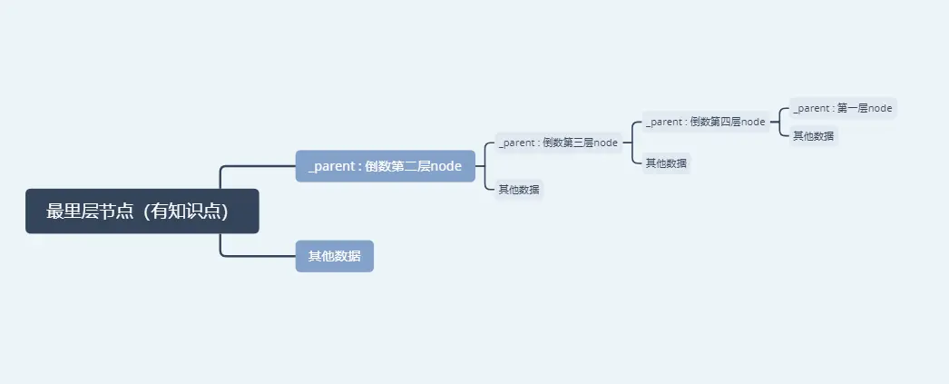 - 如上面的代码解释到,将数组中的node先存起来,如果发现node中不存在知识点hasContent,则将存起来的以第二个参数parent的形式传回去,传回去则变成下一级数组的parent参数,也就是说,从最外层开始,直到找到hasContent,最外层的node会一直以parent的形式赋值给里面的一层,变成如下图所示
