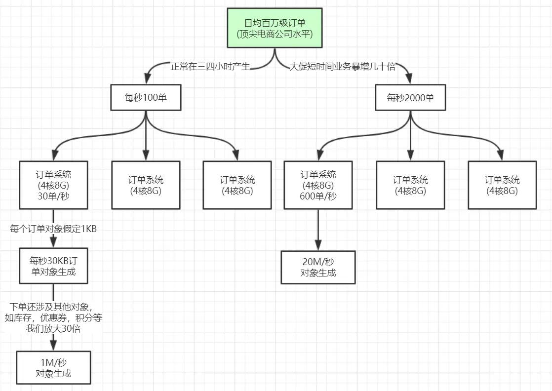 日均百万订单主要集中在当日的某几个小时内产生,假设是3小时,也就是每秒大概生成100单左右。这种系统一般至少要三四台机器去支撑,假设我们部署了3台机器,也就是每台每秒钟大概处理完成30单左右。也就是每秒大概有30个订单对象在堆空间的新生代内生成,一个订单对象的大小跟里面的字段多少及类型有关,int类型占用4字节,double类型占用8字节,初略估计下一个订单对象大概1KB左右,也就是说每秒会有30KB的订单对象分配在新生代内。