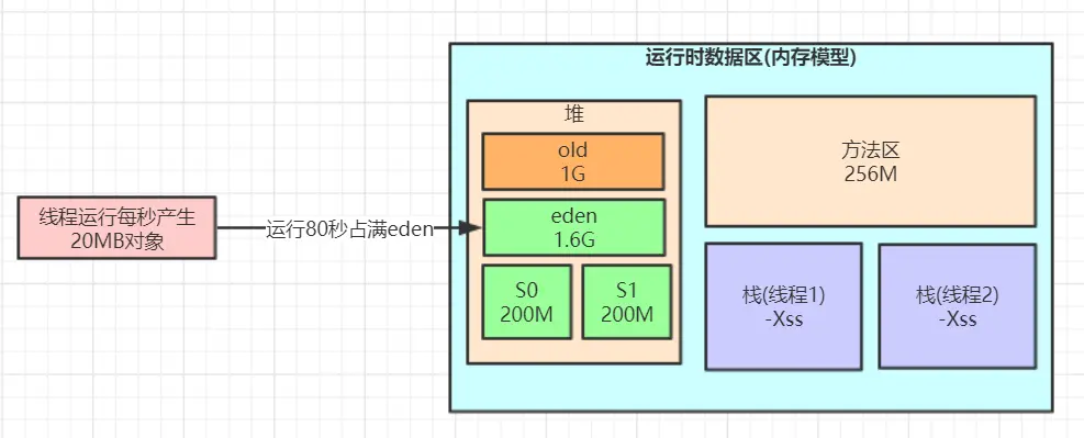 真实的订单交易系统肯定还有大量的其他业务对象,比如购物车、优惠券、积分、用户信息、物流信息等等,实际每秒分配在新生代内的对象大小应该要再扩大几十倍,我们假设30倍,也就是每秒订单系统会往新生代内分配近1M的对象数据,这些数据一般在订单提交完的操作做完之后基本都会成为垃圾对象。