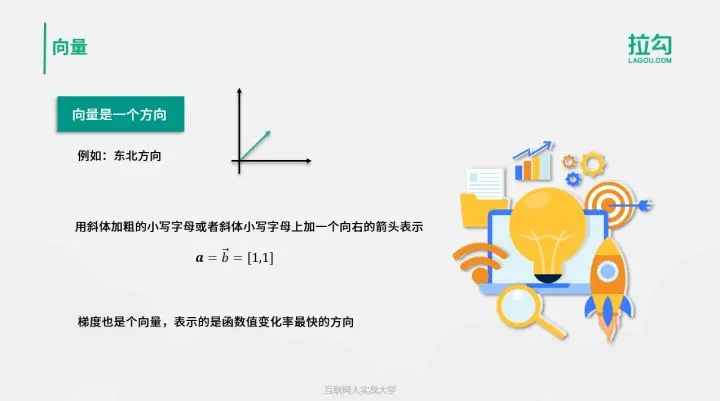 我们首先来学习向量的知识。在这里只需学习与机器学习有关的内容。我们在高中时就开始接触向量,它的基本运算并不会困扰我们。向量是一个有方向的量,它的表示形式是斜体加粗的小写字母或者斜体小写字母上加一个向右的箭头。别忘了,在上一课时计算函数的梯度时,梯度也是一个向量,表示的也是一个有方向的量,是函数值变化率最快的方向。