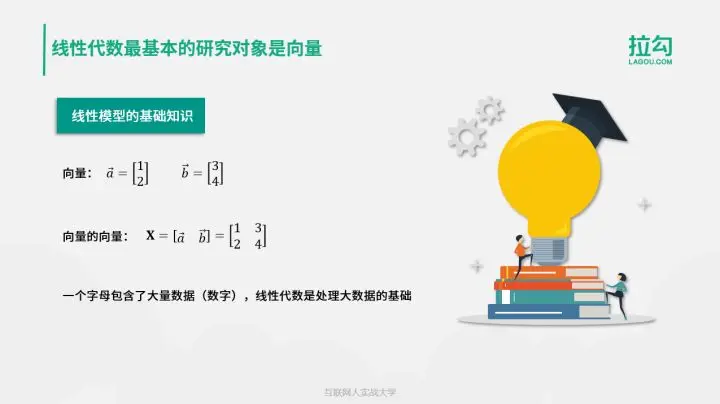 既然名字叫作线性代数,那么它一定是线性模型的前置基础知识。线性代数最基本的研究对象是向量,向量的向量又组成了矩阵。有了向量或者矩阵,就能将很多数字用一个向量符号表示,甚至可以将很多高维的数据用一个矩阵来表示。因此,你可以理解为线性代数是处理大数据的基础。
