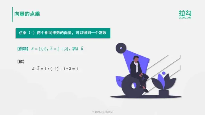 除了普通的加法以外,向量的另一个重要运算就是点乘了。点乘两个相同维数的向量,可以得到一个常数。点乘的计算方法是两个向量对应项乘积之和。例如,计算向量 [1,1] 和 [-1,2] 的点乘,计算过程就是 1*(-1)+1*2,结果等于 1。