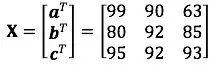 接着我们来看一下矩阵。你应该是上了大学之后才开始接触矩阵的。矩阵可以形象的理解为是向量的向量,通常用加粗大写字母表示。在机器学习中,通常会用一个矩阵来表示一个大数据集。其中每一行是一个样本的不同维度,列方向则是集合中的每一条数据样本。例如如图所示的 3 名同学 3 门课的考试成绩。