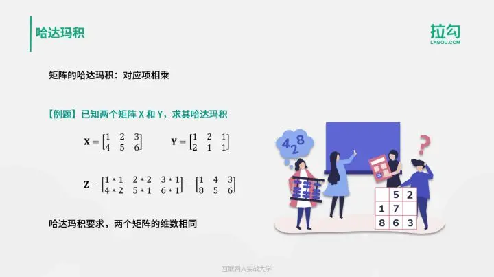 除了乘法以外,矩阵的基本运算还有哈达玛积。它要求两个矩阵的维数完全相同,计算方式是对应项元素的乘积。例如,