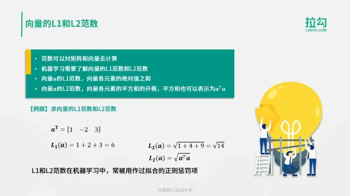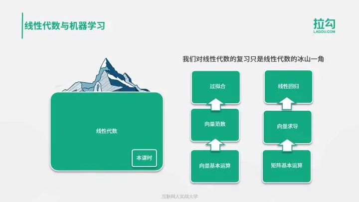 其中,范数的知识,是在机器学习中克服模型过拟合的重要手段。不管是 L1 还是 L2,范数可被用作损失函数的惩罚项,也称作正则项,用来指导模型的学习训练。范数值越大,说明模型参数绝对值整体偏高,则说明模型的复杂度偏高。自然地,过拟合风险也就比较高。关于过拟合的知识,我会在后面专门拿出一个课时来讲解。另外,线性代数作用在线性模型居多。线性回归是回归的入门级算法。对于线性回归模型的最优化过程,需要大量的向量求导计算。