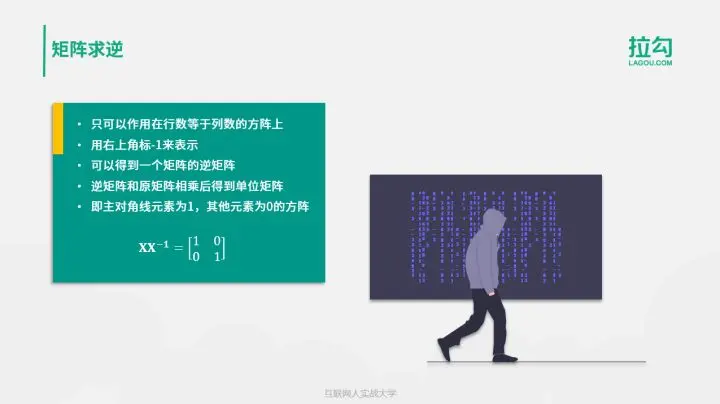 关于矩阵,你还需要掌握求逆运算。求逆运算只可以作用在行数等于列数的方阵上,用右上角标 -1 来表示,可以得到一个矩阵的逆矩阵。逆矩阵满足这样的性质,它和原矩阵相乘后,可以得到单位矩阵,即主对角线元素为 1,其他元素为 0 的方阵。例如,