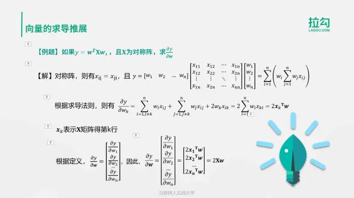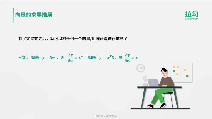 接下来,看一下向量关于向量的求导。向量 y 关于向量 w 的求导结果是向量 y 中每个元素关于向量 w 中每个元素求导结果的矩阵。如果向量 w 的维数为 n x 1,向量 y 的维数是 m x 1,则求导之后的矩阵维数就是 n x m。特别需要注意,当 m=1 时,向量 y 是个常数,此时定义同样成立。