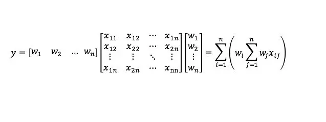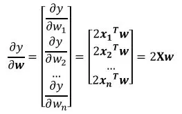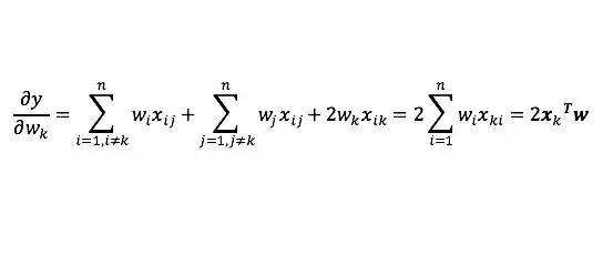 且 X 为对称矩阵,求向量 y 关于向量 w 的导数。由于是对称矩阵,所以存在xij = xji。此时计算的结果 y,是一个 1 x 1 的向量。根据乘法计算展开后,得到