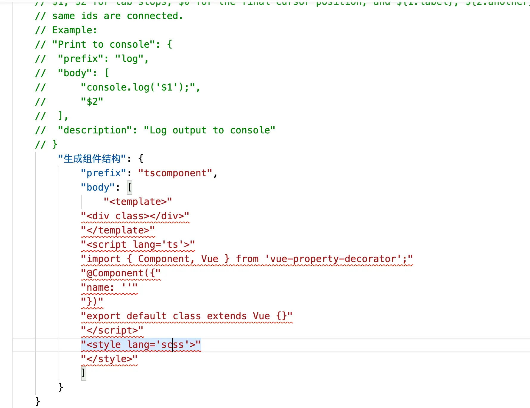 第一步: 基于vscode的Snippets 通过vscode的snippets我们可以自己配置自定义的snippets,从而实现快捷生成代码片段: