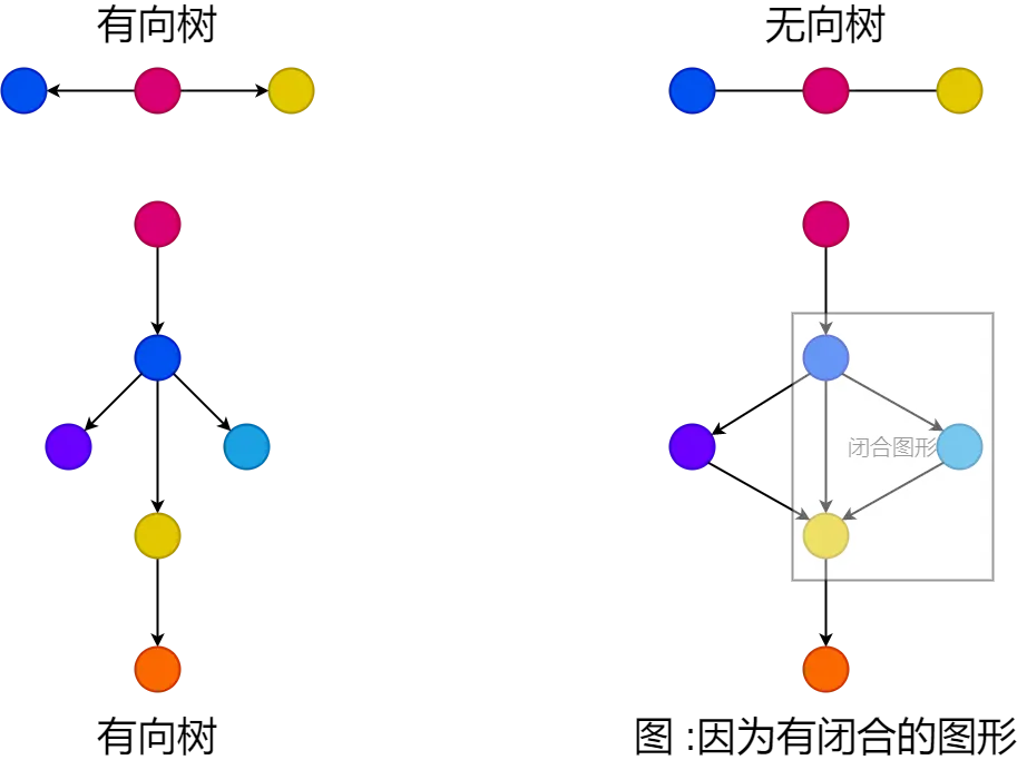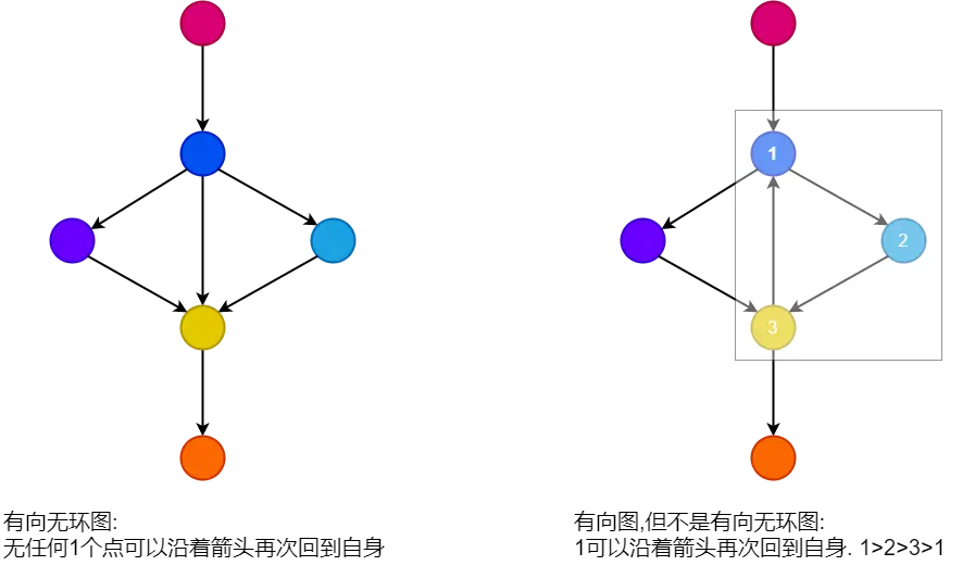 - 整张图上不允许出现沿着箭头从一个节点出发最后能又回到起点的情况