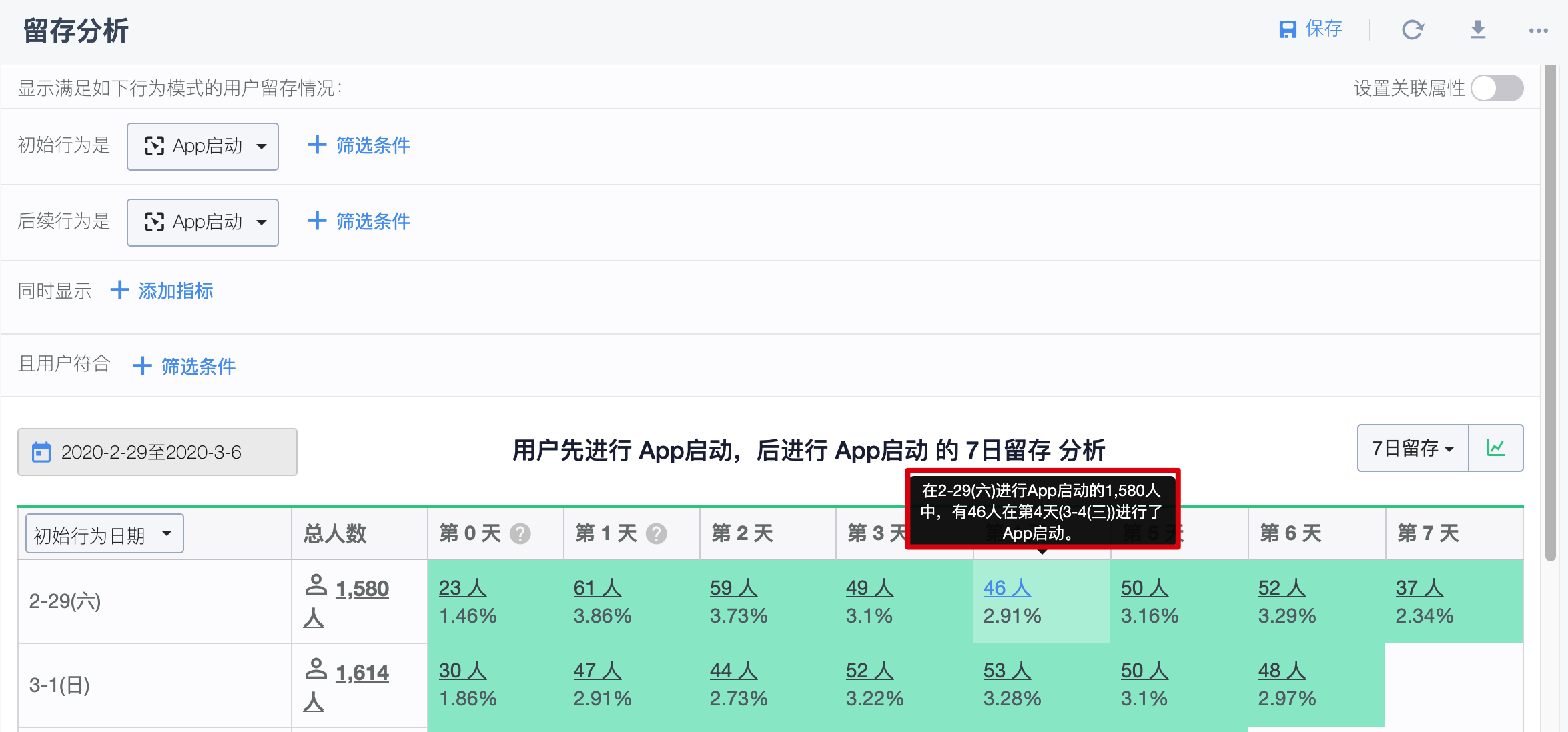 举例来说,如果此时选择 7 日留存分析,我们分析的基准单位为日,选定时间段则应为 1 日,否则留存总人数就会出现如下的情况: