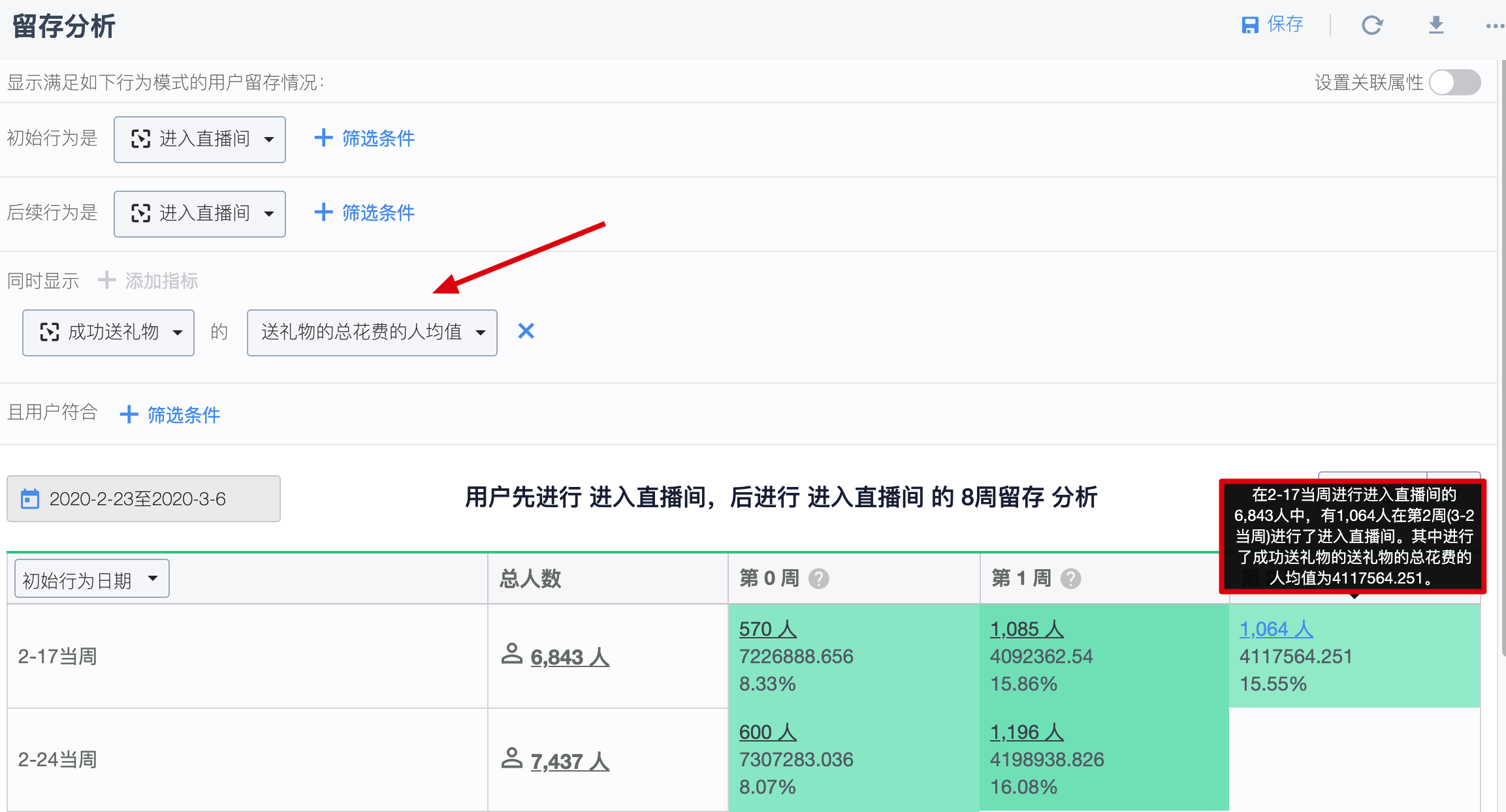 上图中,初始行为和后续行为均选择了“进入直播间”行为,为了同时能够分析用户的留存价值,我们加入了一个用户行为指标——成功送礼物花费的人均值。
