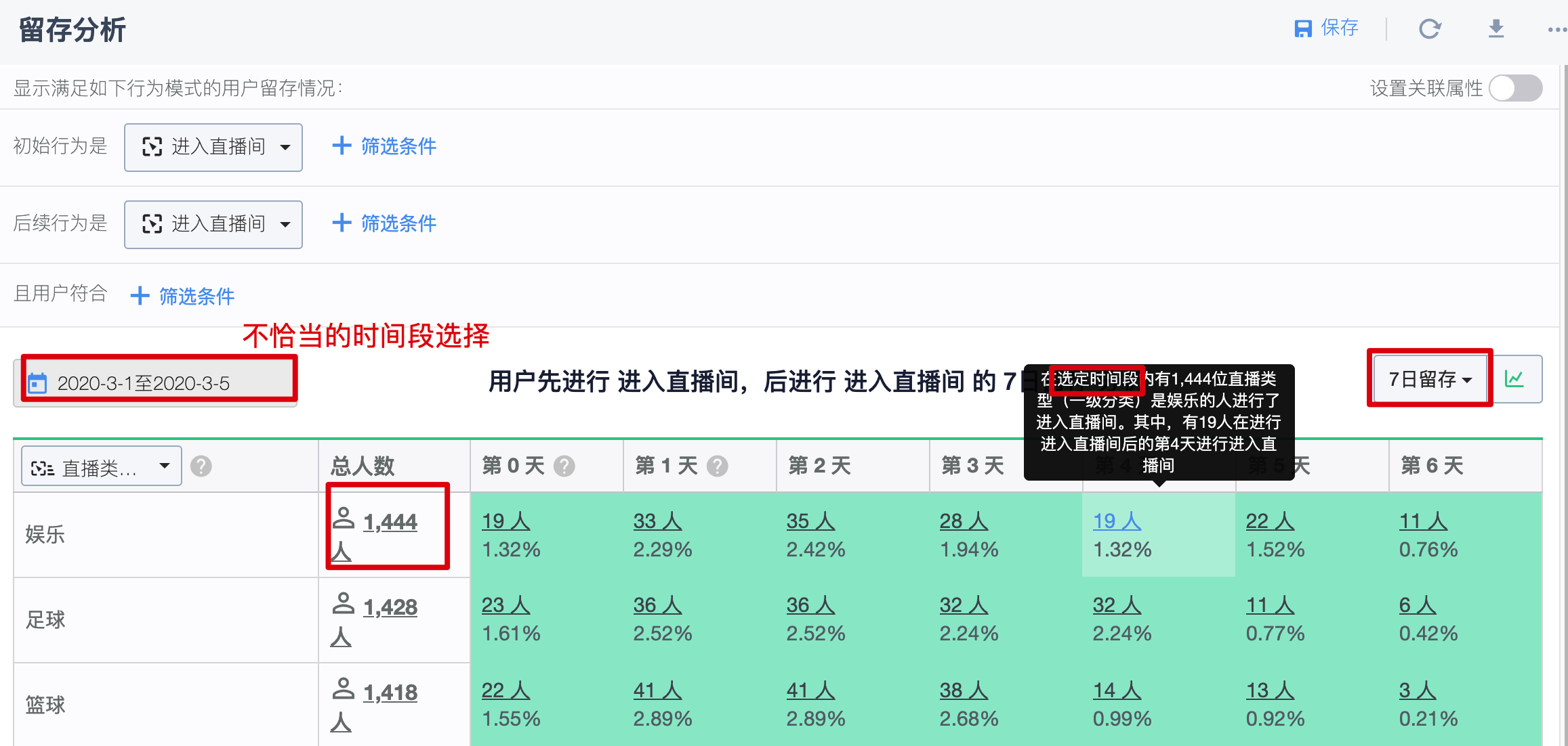 图中选择的时间段为 3-1 至 3-5,选择 7 日留存分析时,分析的基准单位为 1 日。可以看到,足球分类下的留存总人数为 1444 人,这个人数是 3-1 至 3-5 日进入直播间且直播类型为娱乐的全部人数,若将该人数作为留存的分母,显然是不恰当的。