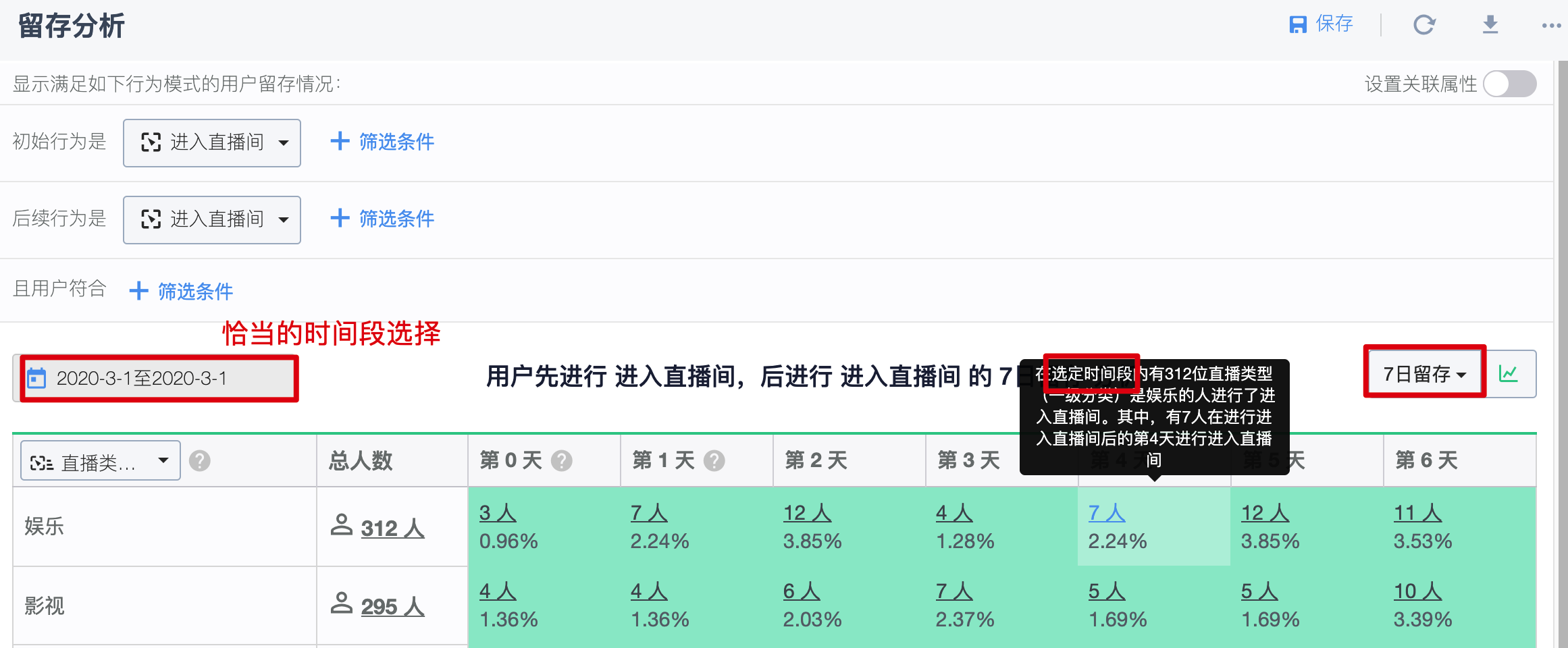 这是因为前几日进入直播间且直播类型为足球的人数可能就不到 1400 余人,怎么能将其作为前几日的留存分母呢,这种情况下的数据也是没有意义的。下面给出正确的时间段选择,见下图: