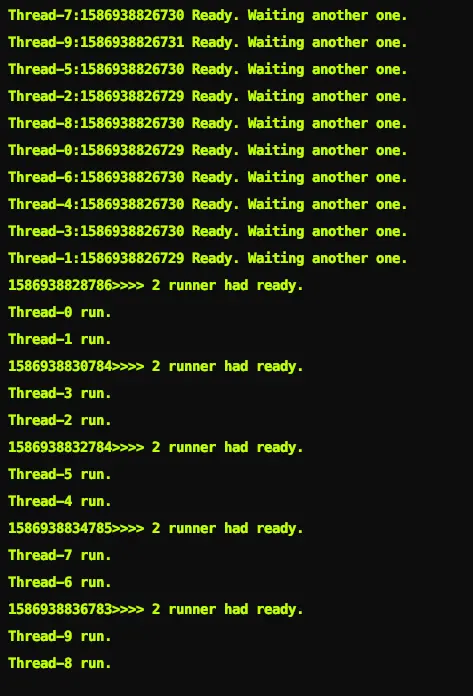 () -> System.out.println(System.currentTimeMillis() + ">>>> 2 runner had ready."));