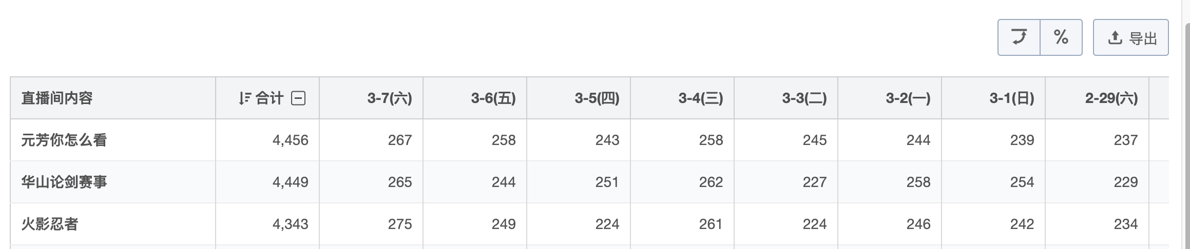 例如图中我们发现“元芳你怎么看”“火影忍者”等直播间流失人数较高,这可能是由于版权的因素导致的流失,而“华山论剑职业联赛”则是因为赛事结束的因素,用户不再进入直播间,不同类型的原因制定的策略自然也就不同。