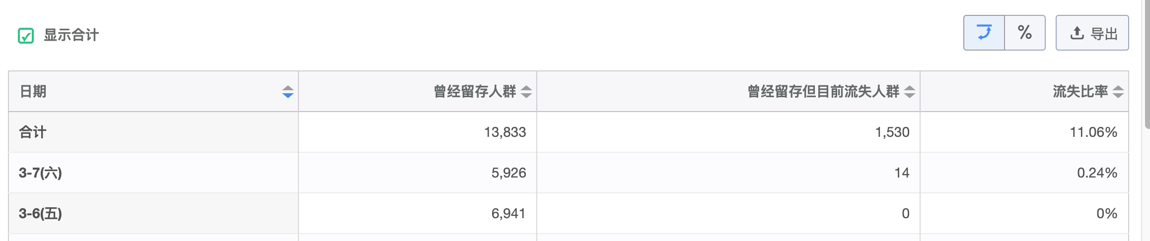 我们发现,核心人群每天大概 5 千到 6 千,流失的人数每天小于 50,流失比率小于 5%。