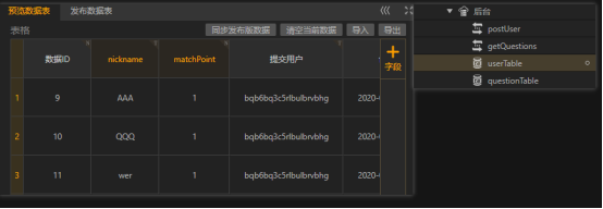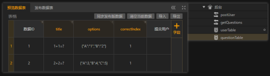 存储题目的questionTable数据库添加了三个字段,title存放题目;options存放选项,并写成JSON格式;correctIndex存放正确答案的序号。存放玩家数据的userTable数据库中nickname字段存放玩家昵称,matchPoint存放玩家总共的胜局数。
