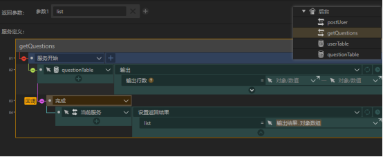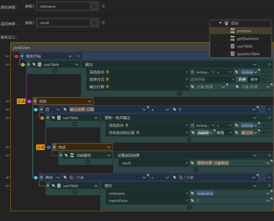 GetQuestions服务负责将questionTable中的题目输出并发送给前台,postUser服务则负责从是数据库中找到获胜玩家(如果找不到就添加一条玩家数据),并更新其matchpoint字段。