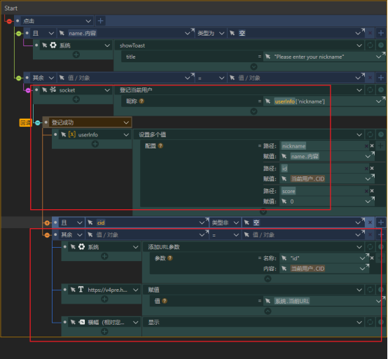 1.第一步,对战的发起玩家A打开案例,输入昵称后点击Start按钮,这时会先对当前玩家进行登记,然后将A的信息存入userInfo,注意此时变量“cid”还是空值,所以执行的是其余的条件分支,系统会将当前用户A的CID码添加到URL中,然后显示一个横幅,上面就是添加好参数的分享链接,用户把这个链接分享给好友B即可。