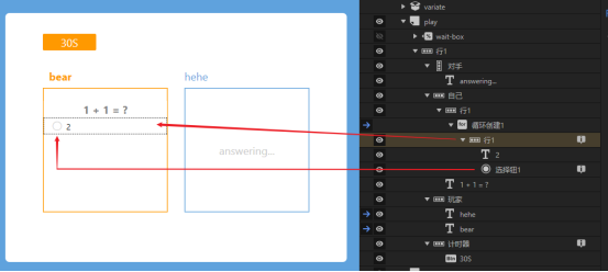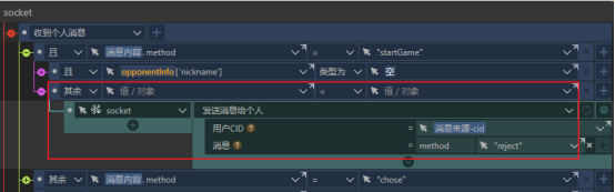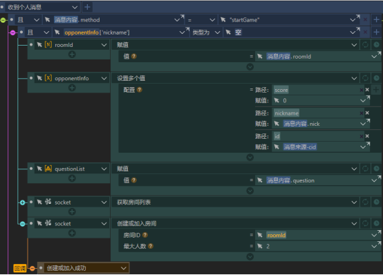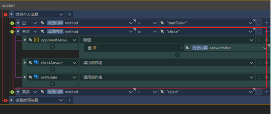 现在来说一下玩家在答题倒计时结束前进行答题的情况,当玩家点击了选项行或者该选项行中的选择钮,就会把该选项的序号赋值给answerIndex,并且如果对手并未答题对局也没有结束(即opponentAnswer仍为初始值-1,finalResult仍未初始值0),则玩家会给对手发送一条method为chose的个人消息,消息内容就是自己的答题结果。然后执行checkAnswer和setVariate两个动作组。