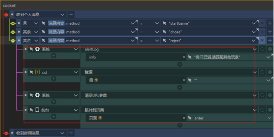 在上一篇帖子中简单介绍了连接组件,并使用连接实现了一个简单的私聊模型,今天我们来制作一个实时对战答题模型。大体的设计思路是,用户A登记进入连接并将自己的CID添加到URL中转发给好友B,B打开带有URL参数的案例创建一个房间并对A发出邀请,A进入房间后答题开始,答对加分,答错对方加分,最后统计总分数分出胜负。