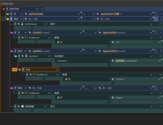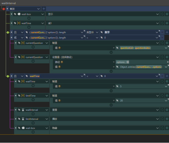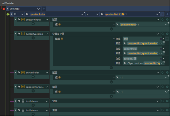 setVariate动作组会先判断questionIndex的值,如果不等于questionList的行数减1则说明当前题目还不是最后一道题,就会将questionList中的下一道题的内容赋值给currentQuestion,重置waitInterval触发器和limitInterval触发器。