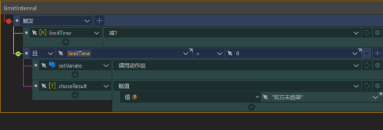 上面几个步骤之后A,B两个玩家都执行到播放waitInterval触发器了,它实现的是每道题目开始答题前的准备倒计时,并且在结束时会把题目列表中的第一题赋值给“currentQuestion”,然后将自己重置并播放limitInterval触发器。