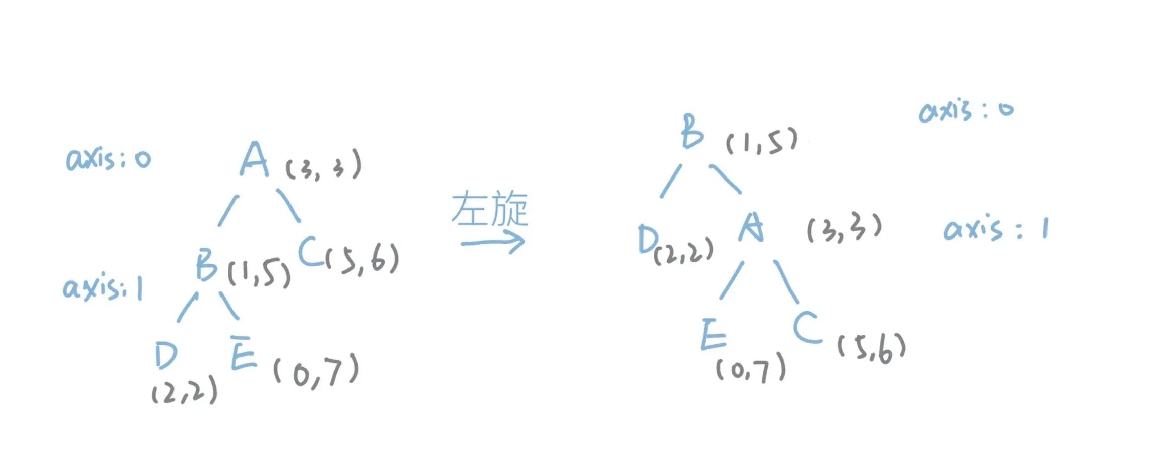 我们给每个节点标上了数据,在树深为0的节点当中,划分维度是0,树深为1的节点划分维度是1。当我们旋转之后,很明显可以发现KD-Tree的性质被打破了。