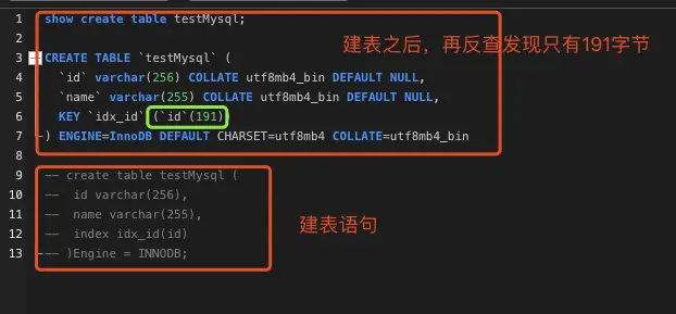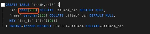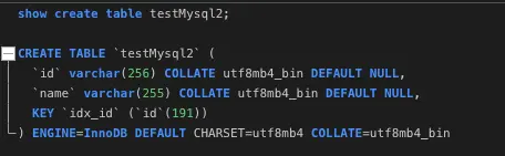 如果建表时就指定索引长度大于191 ,我们看下会有什么结果?