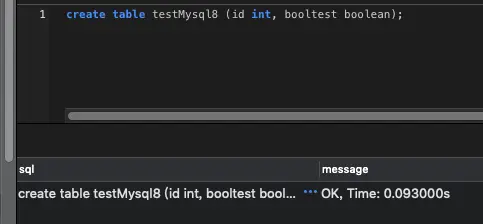 MySQL实际上没有内置的布尔类型,声明为布尔类型,会使用TINYINT(1)存储。 看个例子:
