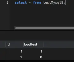 booltest 字段确实是tinyint(1) 类型。那我们尝试往里面插入一条true 跟false ,然后select 一下看看。