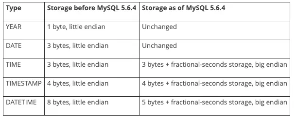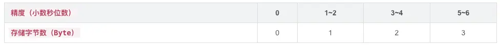 为什么从5.6.4 分开,这是因为从这个版本开始支持小数的秒。 那么小数秒的存储占用几个字节,取决于精度: