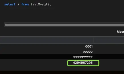从上述截图可以看到,1这个数字长度不足显示宽度4, 则会以0补齐(如果不指定zerofill ,则默认以空格填充),22222 长度已经大于显示宽度4, 也已经存储进去了。 下面我们插入一个超过int 所表示范围的数字:(int 的最大范围是20几亿,我们插入一个大于这个数的值)