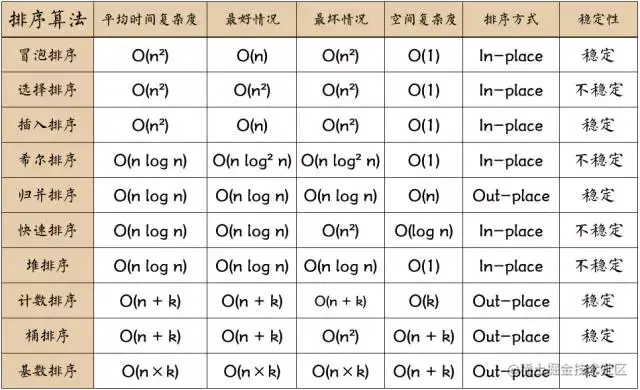 图片名词解释: n: 数据规模 k:“桶”的个数 In-place: 占用常数内存,不占用额外内存 Out-place: 占用额外内存