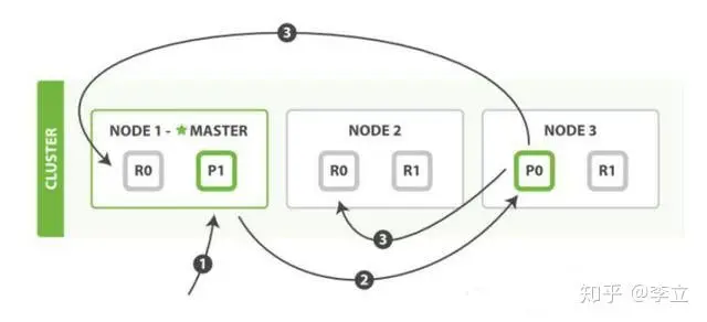第二步:节点 1 接受到请求后,使用文档_id 来确定文档属于分片 0。请求会被转到另外的节点,假定节点 3。因此分片 0 的主分片分配到节点 3 上。