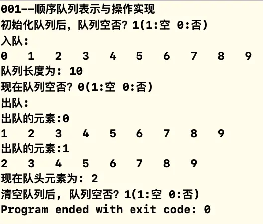 printf("001--顺序队列表示与操作实现\n");
